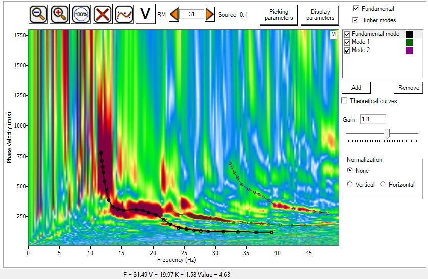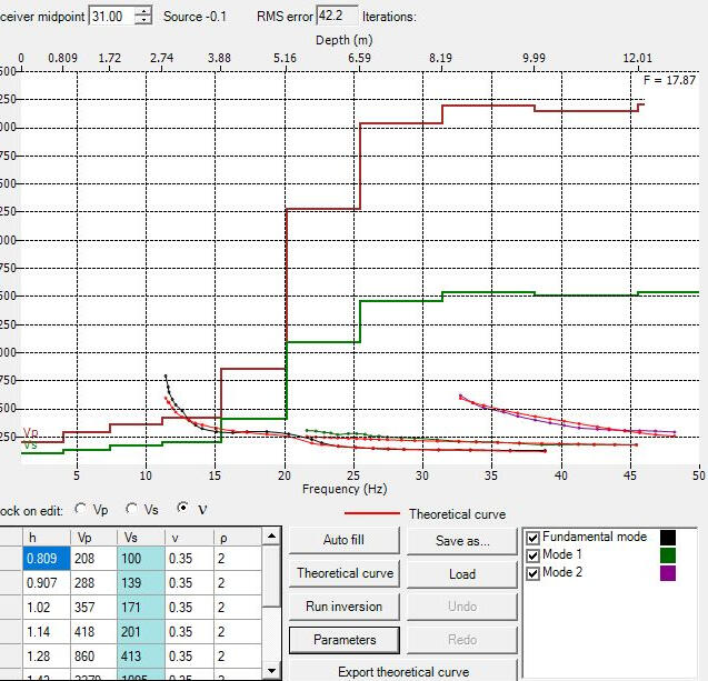 Наиболее передовая и быстро развивающаяся в настоящее время в малоглубинной сейсмике методика обработки, основанная на многоканальном анализе поверхностных волн (MASW), позволяет получать достаточно детальные одно- и двухмерные модели распределения скоростей поперечных волн Vs в массиве грунтов. Естественным ограничением методики MASW является небольшая глубина проникновения энергии поверхностных волн в толщу грунтового массива. Существенным фактором для увеличения глубинности метода является возможность привлечения для совместного анализа с полученными в активном режиме записями пассивных низкочастотных шумов транспорта и работающих механизмов.Основными предпосылками для многоканального частотного анализа является преобладание энергии компоненты поперечных смещений при распространении колебаний вдоль поверхности раздела сред и частотная дисперсия фазовых скоростей – увеличение видимого периода и, соответственно, увеличение глубины проникновения энергии поверхностной волны в толщу грунтового массива с возрастанием скорости распространения поперечных смещений. Слева показана матрица фазовых скоростей нескольких гармоник поверхностной волны Рэлея, характеризующая сильную частотную дисперсию фазовых скоростей. В расчете модели скоростей поперечных волн использованы дисперсионные кривые нулевой, первой и второй гармоник поверхностной волны.