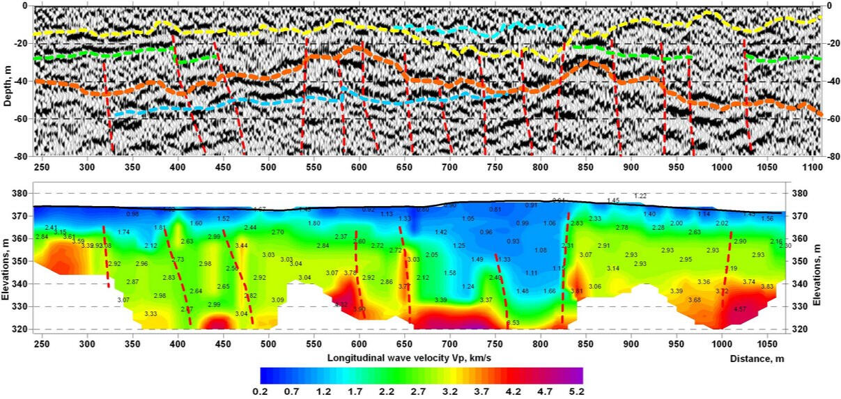Георадарный разрез с антенной 900 МГц и разрез скоростей продольных волн