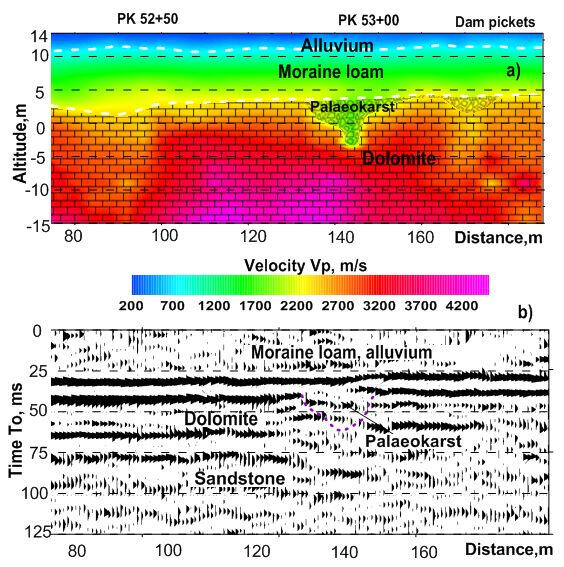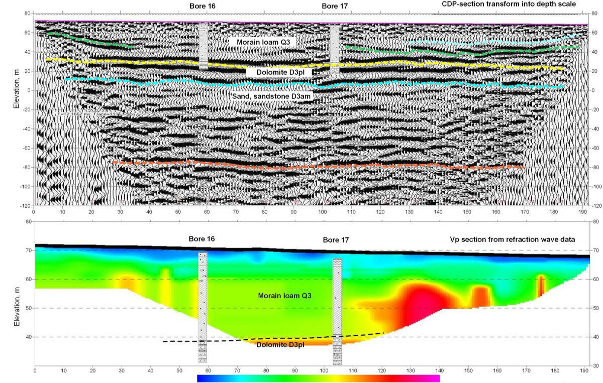 На этом профиле отчетливо прослеживается кровля коренных доломитов на глубине 20-23 м под мощным слоем моренных суглинков. В бортовых частях долины прослеживаются отражающие границы, связанные, предположительно, с отложениями крупнообломочных прибортовых делювиальных шлейфов. На данном примере хорошо проявляются различия в глубинности методов. Так, на разрезе ОГТ прослеживается граница на глубине порядка 150 м, предположительно связанная с подошвой рыхлых аматско-гауйских песчаников, в то время как глубинность на разрезе скоростей по методу рефрагированных волн составляет около 30 м при длине базы приема 126 м.