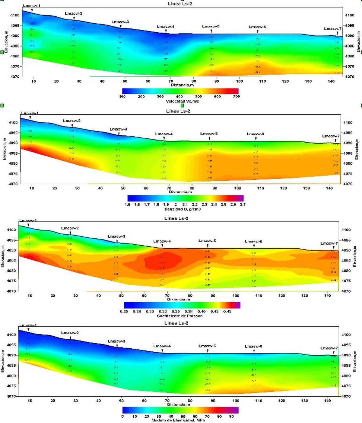 Примеры определения скоростей распространения поперечных волн по данным MASW и прогноза физико-механических свойств грунтов с привлечением метода рефрагированных волн вдоль одной из линий разработки золотоносного поля на юге Перу показаны на следующем рисунке.На основе разрезов скоростей распространения продольных волн по первым вступлениям рефрагированных волн и поперечных волн по методу MASW рассчитаны разрезы прогнозной плотности по скоростям продольных волн, коэффициента Пуассона и модуля упругости по профилю разработки месторождения россыпного золота Chucapaca ( Перу).
