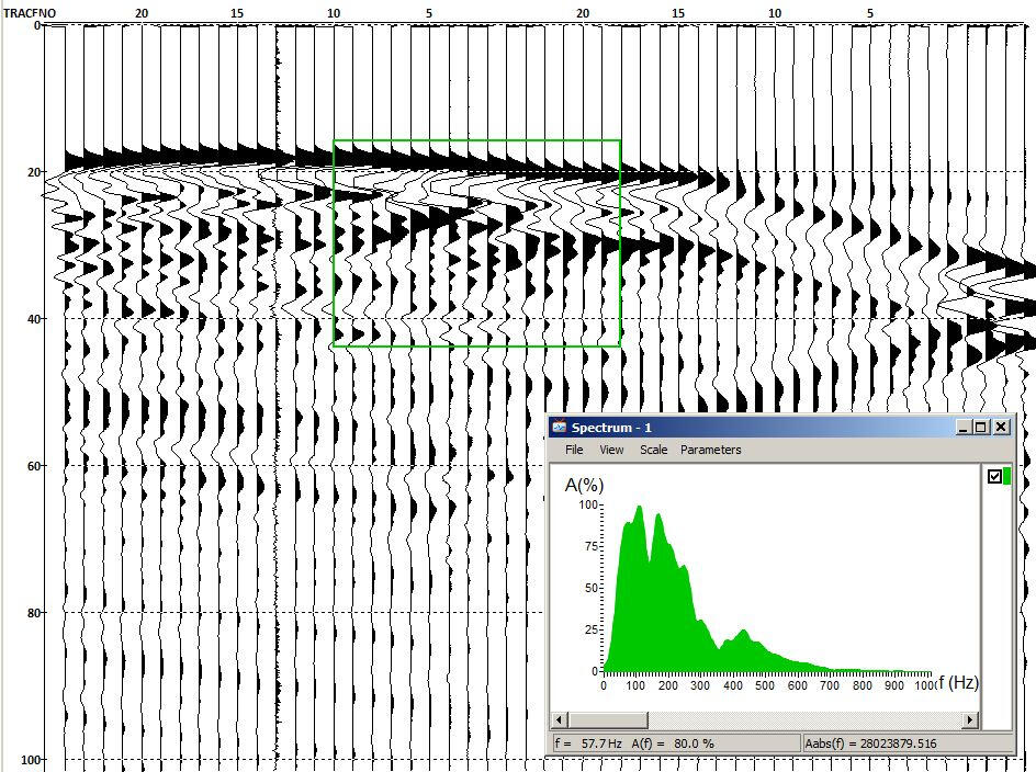 Параметр затухания энергии поверхностных волн рассчитывается по отношениям спектральных составляющих по парам трасс сейсмических записей, равноудаленных от общей для них средней точки на профиле. При расчете отношений учитывается ослабление энергии волн за счет геометрического расхождения фронта по закону обратной зависимости от корня квадратного из расстояния между трассами. При высокой кратности перекрытия наблюдений число трасс, относящихся к каждой средней точке по записям от разных источников велико, за счет чего достигается мощный статистический эффект, сводящий к минимуму, сильные в общем случае, флуктуации спектров из-за различий в приповерхностных условиях установки геофонов.